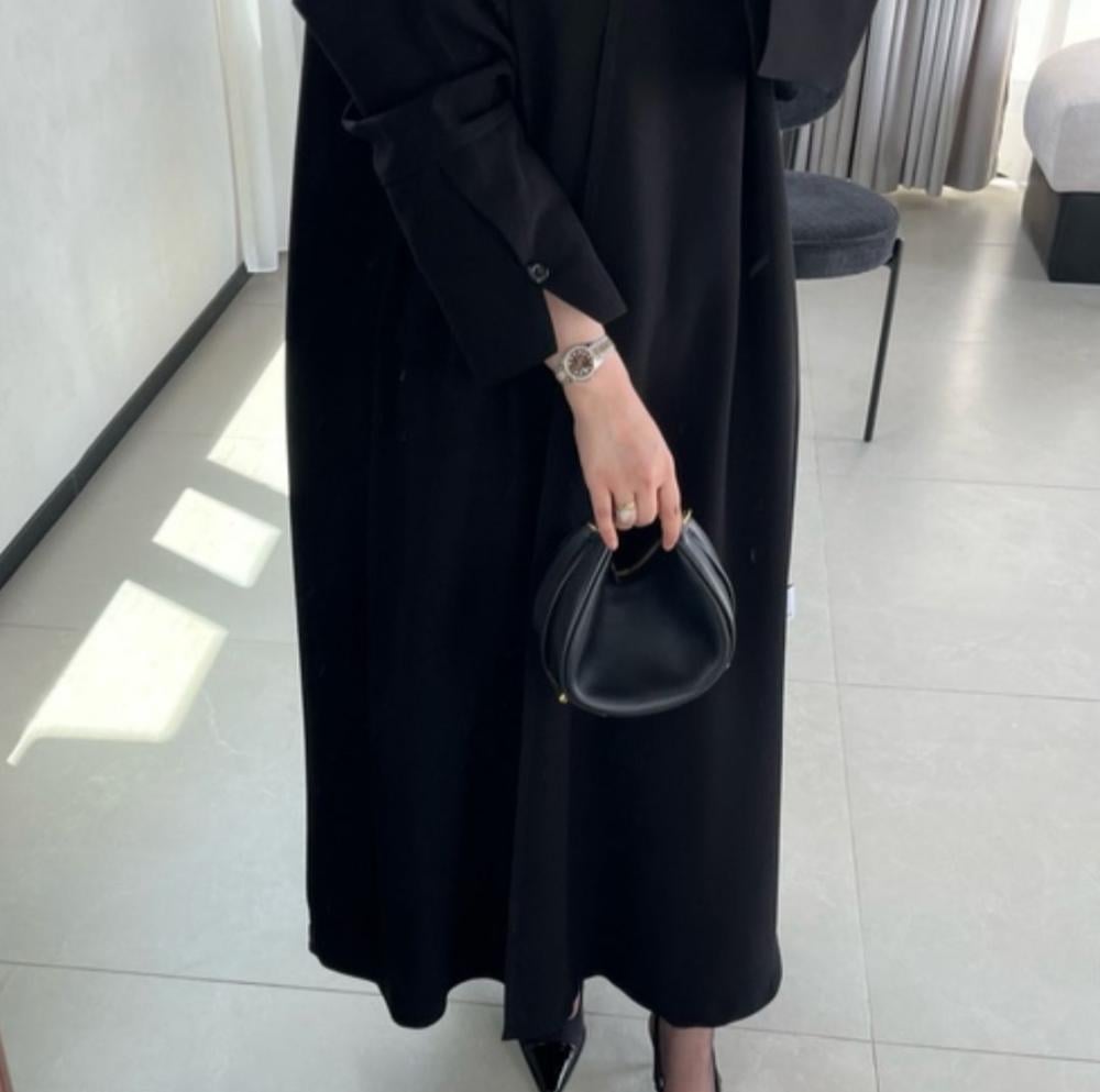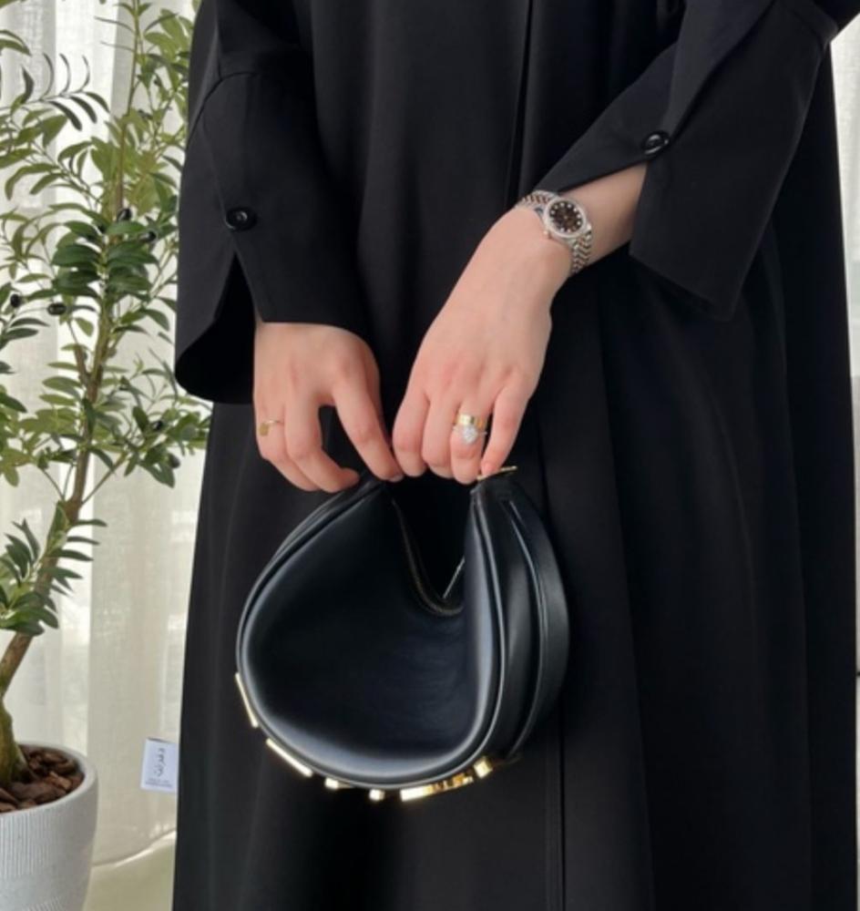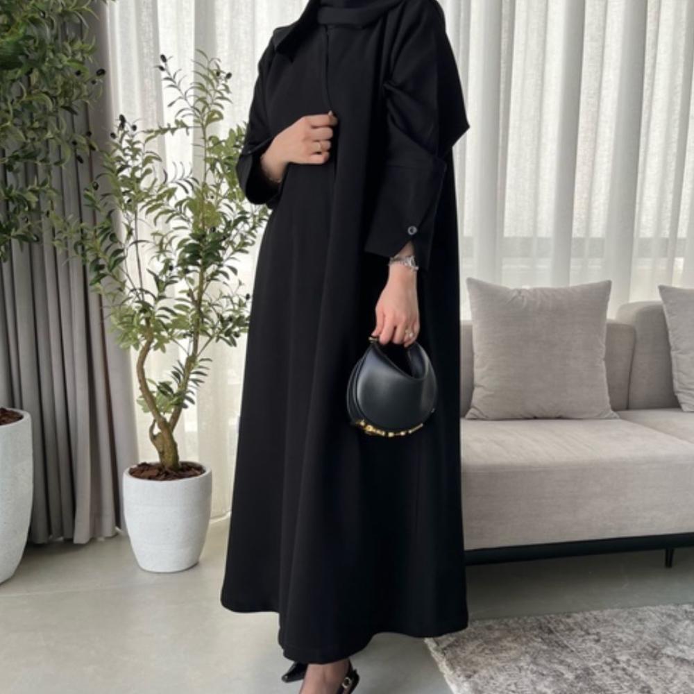 عباية سوداء فاخرة بقصة مستقيمة وانسيابية، قصه أكمام مميزه مزينة بزر أنيق يضيف لمسة راقية، مع تقفيلة أمامية عملية بالطقطق. تصميم يجمع البساطة والأناقة لإطلالة محتشمة وعصرية